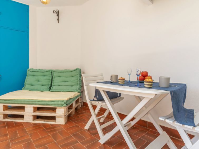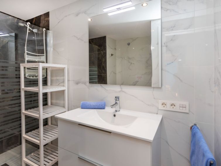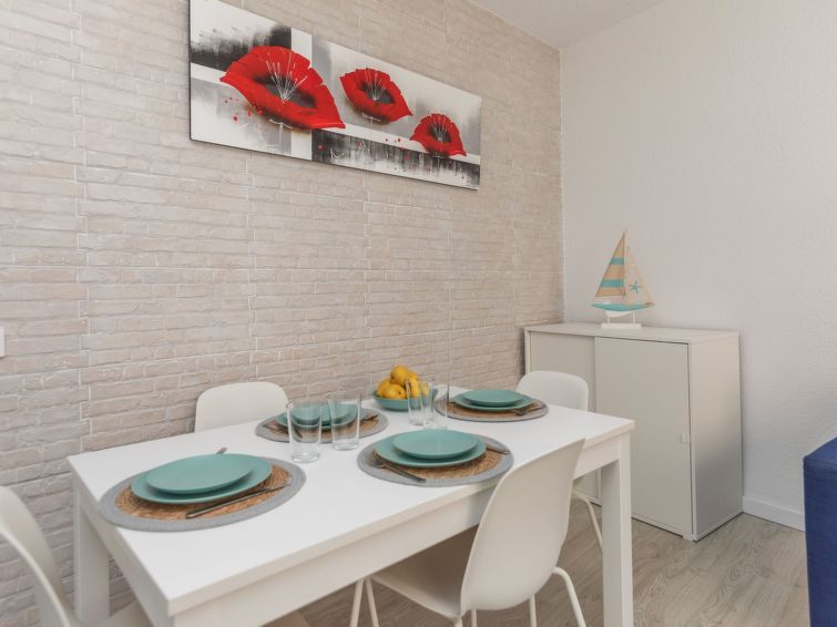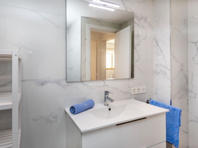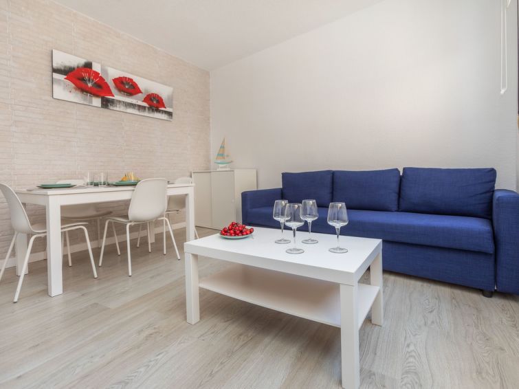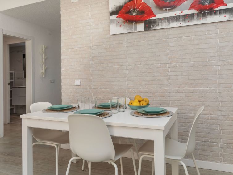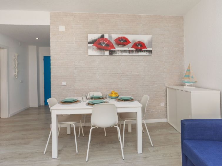 "Palacio del Mar", 2-room apartment 60 m2 on 4th floor. Simple and practical furnishings: living/dining room with 1 sofabed (135 cm, length 190 cm), dining table, digital TV, air conditioning and forced-air heating. 1 room with 1 french bed (1 x 135 cm, length 190 cm), fan. Exit to the terrace.