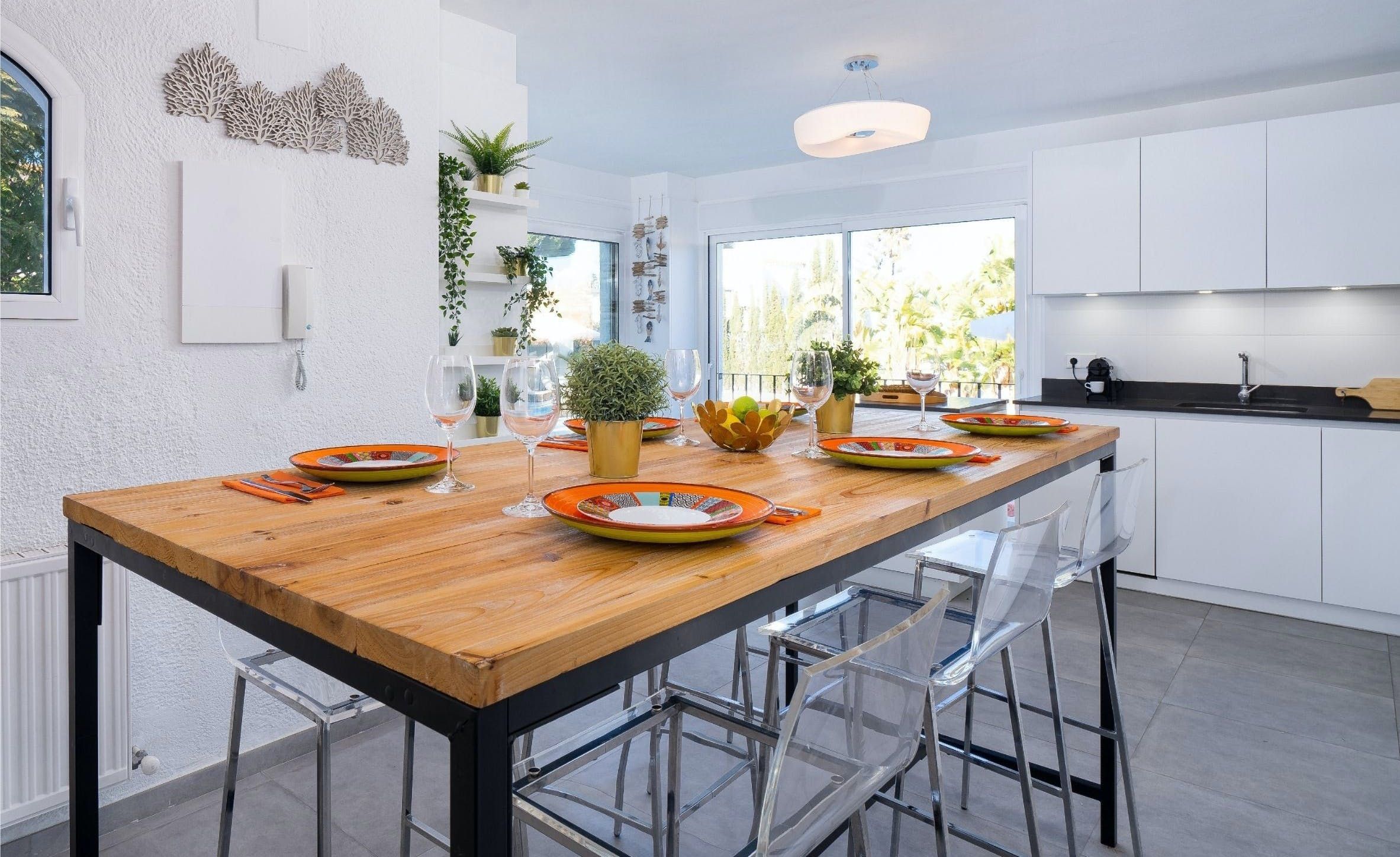 We recommend you spend sunny mornings out on the balcony with a freshly squeezed OJ in hand, and watch the sunrise over the oceans and mountains in the distance. Cook up a delicious breakfast of huevos rotos, and tuck in all together in one of the alfresco dining areas. Head out to the swimming pool to cool off with a few lengths, or sunbathe on one of the poolside loungers with a good book. Head into town for lunch and find a friendly place to eat tapas and drink sangria in the sunshine. When you return home and the evening rolls in, head to your outdoor bar area and pop open the cava for some quality time all together under the stars.