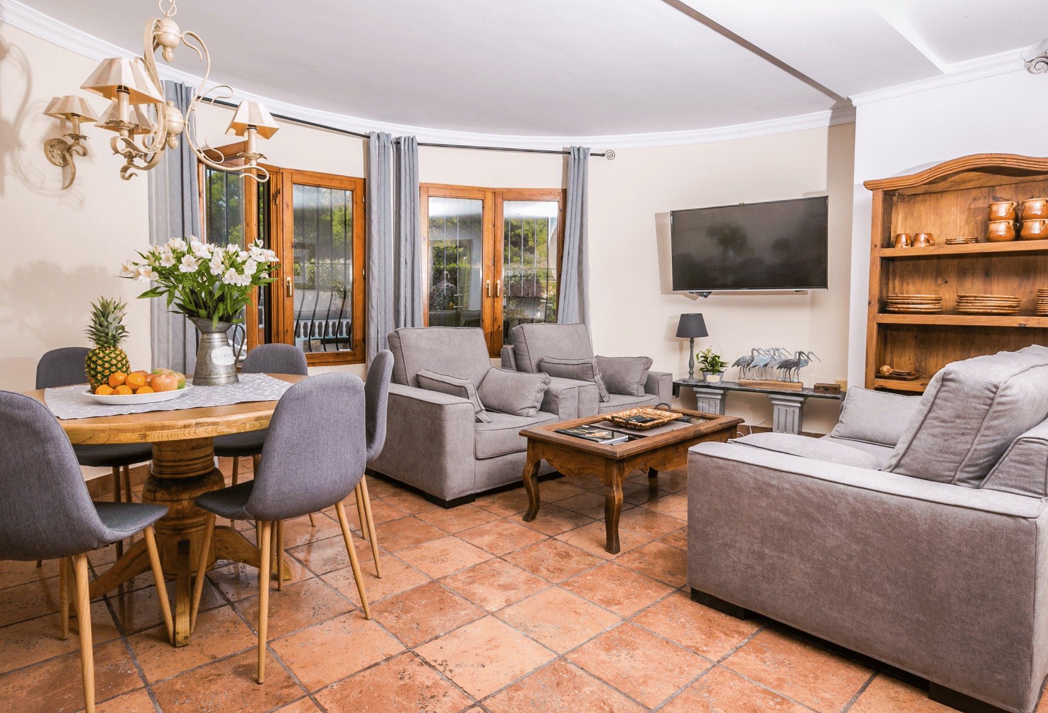 Inside, you'll find that the villa's old-world features seamlessly blend with 21st-century comforts – we're talking terracotta floors at your feet, domed ceilings overhead adorned with wooden beams, and comfy seating inviting you to kick back and relax. Two kitchens and two living areas – one upstairs, one down – make this a great option for groups. There's also an office if you need to work from home.