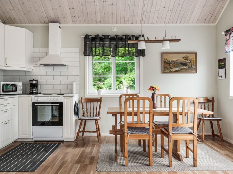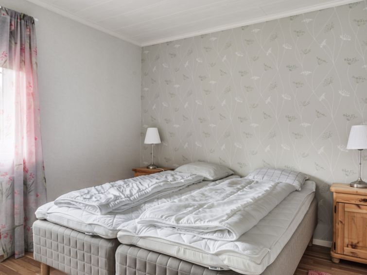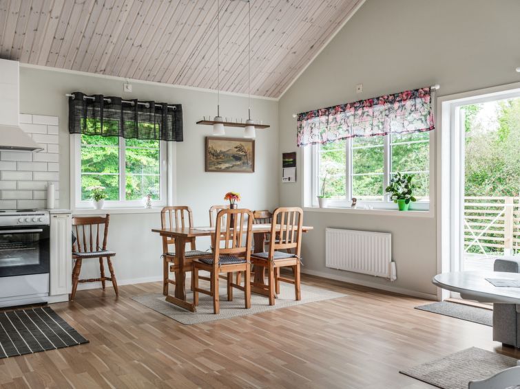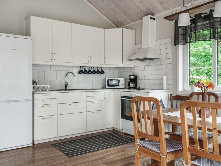 "Gaslunda Tvåan", 3-room house 70 m2. Bright, beautiful furnishings: living/sleeping room with Scandinavian wood stove, dining table, satellite TV and CD-player. Exit to the veranda. 2 rooms, each room with 1 double bed. Open kitchen (4 hot plates, oven, toaster, kettle, microwave, freezer, electric coffee machine).