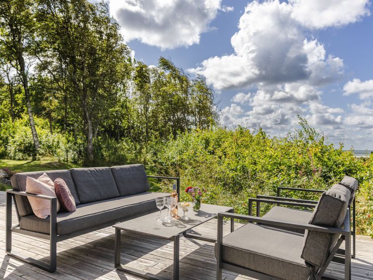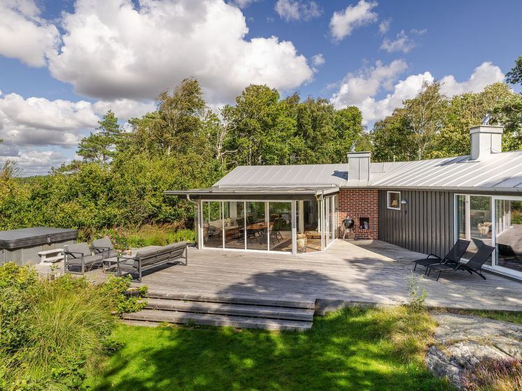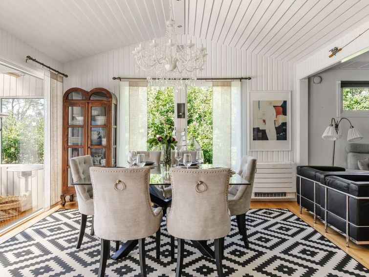 "Utsikten", 4-room house 80 m2. Open living/dining room with 1 sofabed (140 cm), open-hearth fireplace, dining table and TV. Exit to the garden, to the terrace, to the veranda. 1 room with 1 double bed. 1 room with 1 double bed. 1 room with 1 double bed. Kitchen (oven, dishwasher, 4 induction hot plates, toaster, kettle, microwave, electric coffee machine).