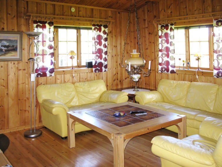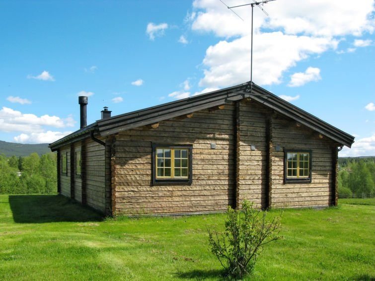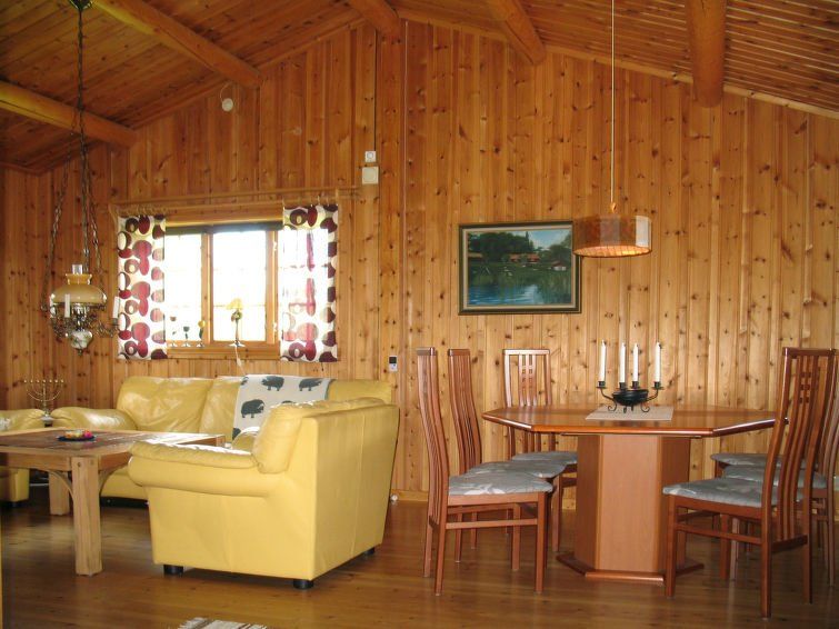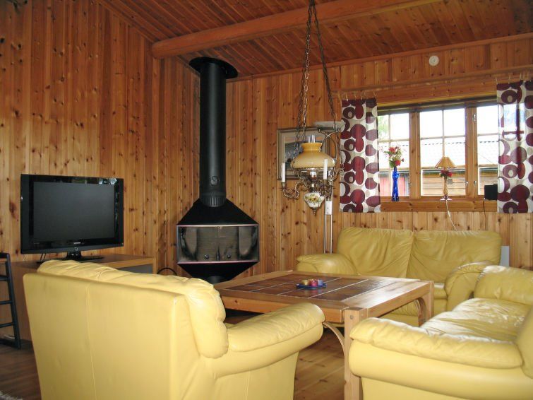 "Vemhån Byn", 3-room house 78 m2. Cosy and wooden furniture furnishings: living/dining room with Scandinavian wood stove, dining table, satellite TV and DVD. Exit to the patio. 1 room with 1 double bed. 1 room with 2 x 3 bunk beds. Open kitchen (4 hot plates, oven, dishwasher, microwave, freezer, electric coffee machine).