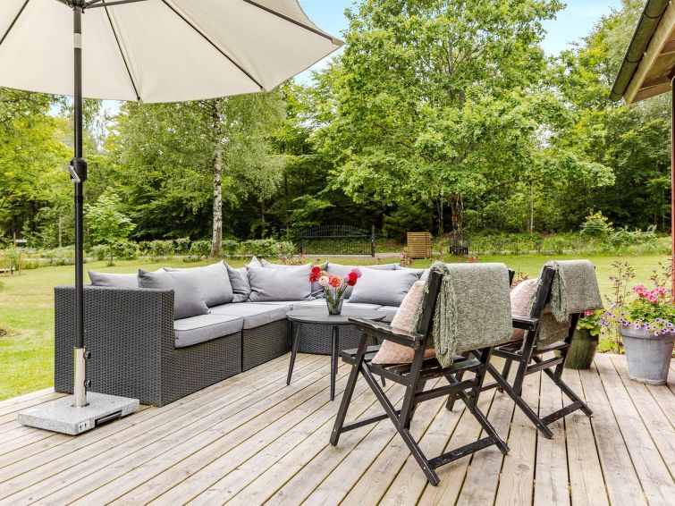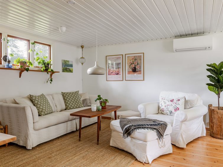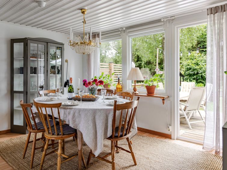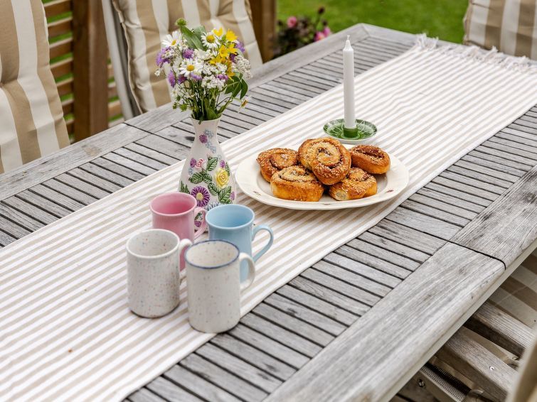 "Torarp Västergård", 4-room house 65 m2. Living/dining room with Scandinavian wood stove, dining table and TV. Exit to the terrace. 1 room with 1 double bed (140 cm, length 200 cm). 1 room with 2 beds (80 cm, length 200 cm). 1 room with 1 double bed (140 cm, length 200 cm). 1 room with 1 double bed (140 cm, length 200 cm).