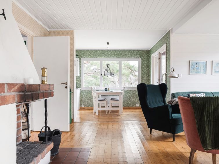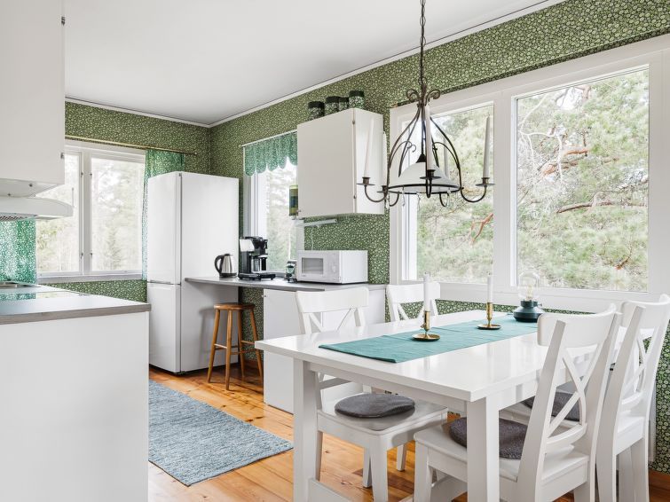 "Smultronstället", 3-room house 65 m2. Comfortable and cosy furnishings: open living/dining room with digital TV. Exit to the balcony. 1 double bedroom with 1 double bed (160 cm, length 200 cm). 1 children's room with 2 folding beds (80 cm, length 195 cm). 1 double bedroom 10 m2 with 2 beds (90 cm, length 200 cm).