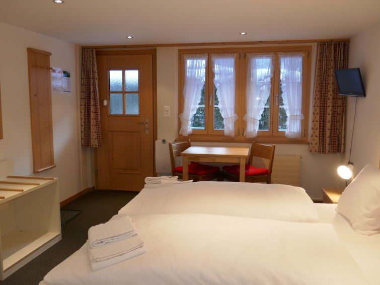 "Schwendihus", 1-room apartment 25 m2, on the ground floor, south facing position. Practical and cosy furnishings: living/sleeping room with 1 double bed (2 x 90 cm, length 200 cm), cable TV (flat screen). Exit to the patio, south facing position. Kitchenette (2 hot plates, toaster, kettle, electric coffee machine).