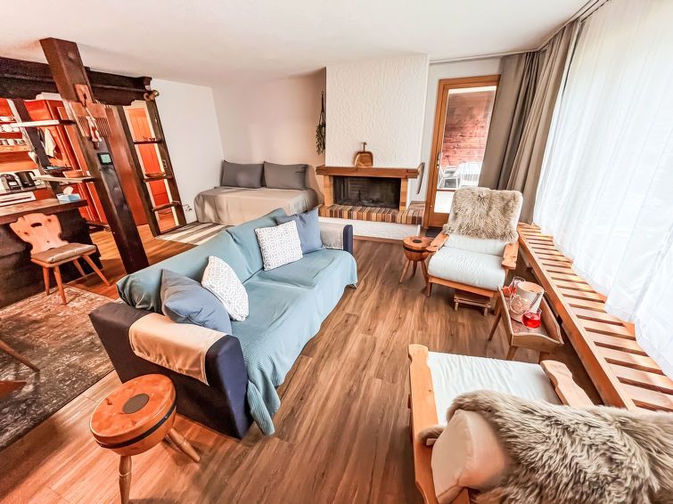 "SnowKaya Grindelwald", 2-room apartment 65 m2, on the upper ground floor, south facing position. Bright, cosy furnishings: living/sleeping room with 2 beds (90 cm, length 200 cm), open-hearth fireplace, cable TV, flat screen and radio. Exit to the balcony, south facing position. 1 double bedroom.