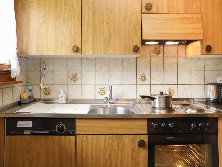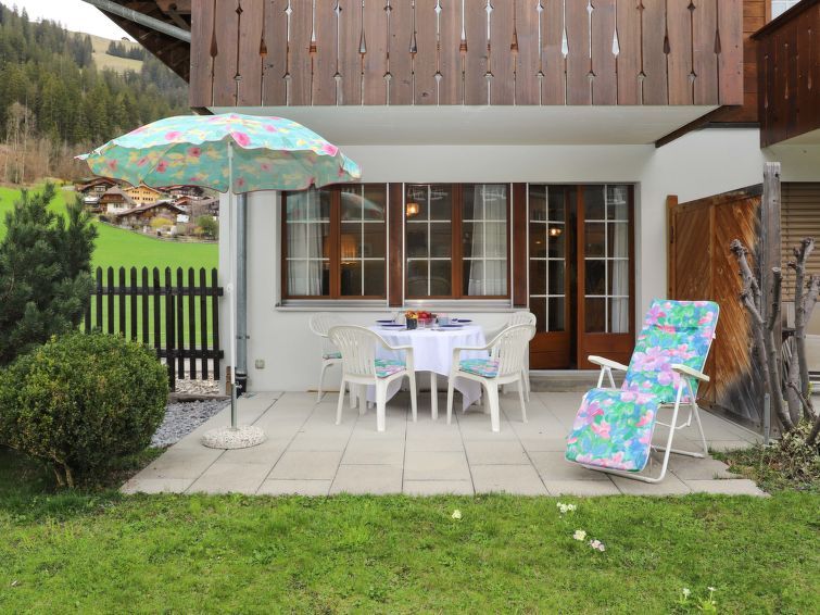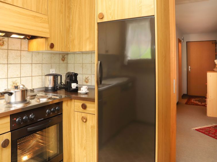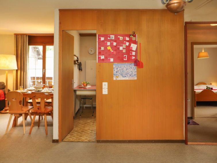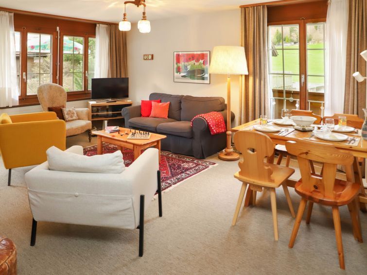 "Chalet Simmental P-3", 3-room apartment 66 m2, on the ground floor, south facing position. Spacious, very cosy furnishings: open living/dining room 23 m2 with dining nook, digital TV and radio. Exit to the terrace. 1 children's room 10 m2 with 2 beds (90 cm, length 190 cm). 1 double bedroom 15 m2 with 1 double bed (2 x 90 cm, length 200 cm).
