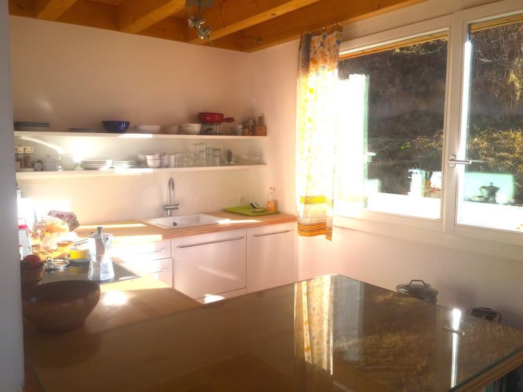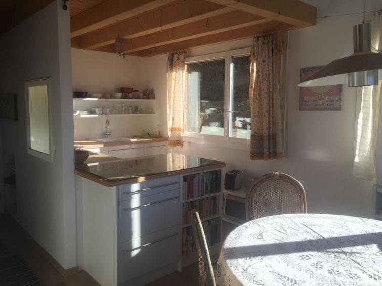 + Covered terrace with lounge sofa, view, evening sun + Extensive kitchen equipment Equipment level is partly high (electric sunroof, induction stove, floor heating in the bathroom), partly simple (stove without steam vent, bathroom without socket, wooden floors in kitchen and bathroom). With 3-4 people there is little privacy and space in the sleeping area (the small gallery has no window that can be darkened/opened, no closet. The rear bedroom is acoustically isolated).