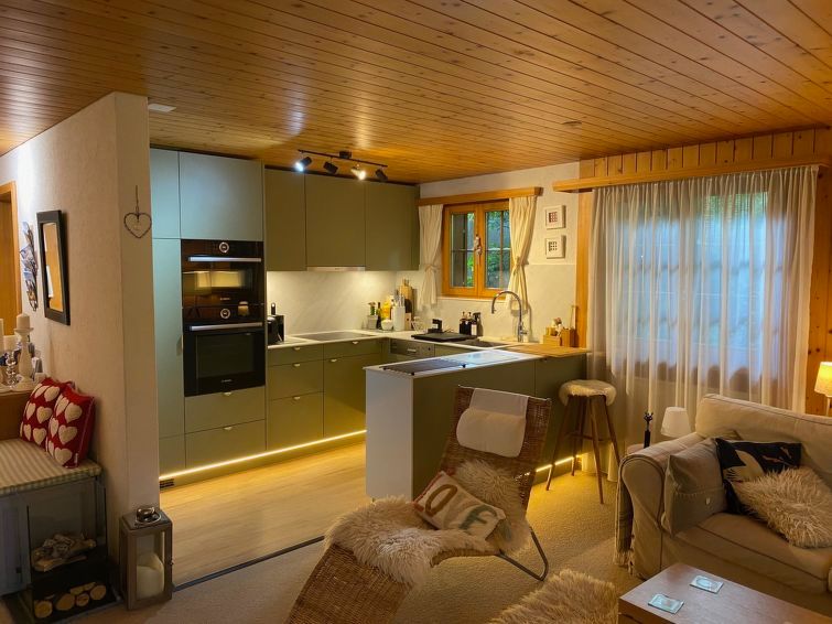 63 m2. More information by the provider: 3 room apartment (63sqm) on the 1st floor of a chalet built in 1981. Quiet location, not far from the village centre and amenities. Terrace with garden furniture and barbecue. Garage space and one additional outdoor parking space. Storage room for sports equipment as well as laundry with washing machine and tumble dryer for common use are in the basement.