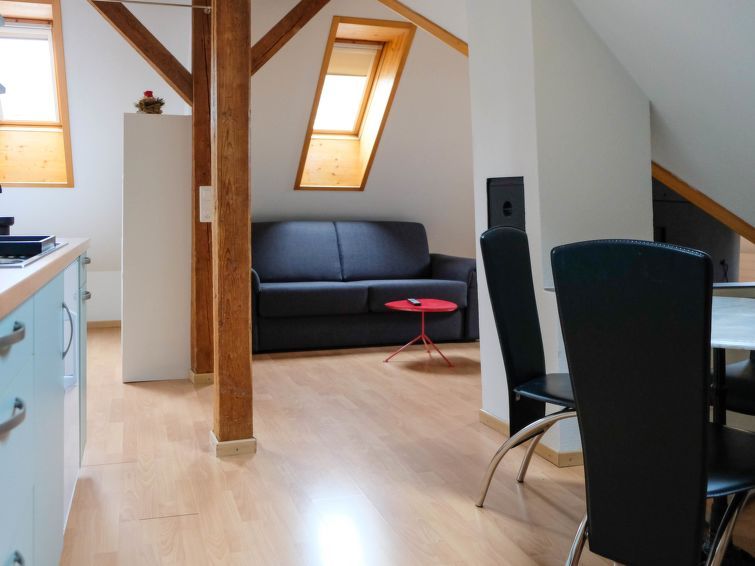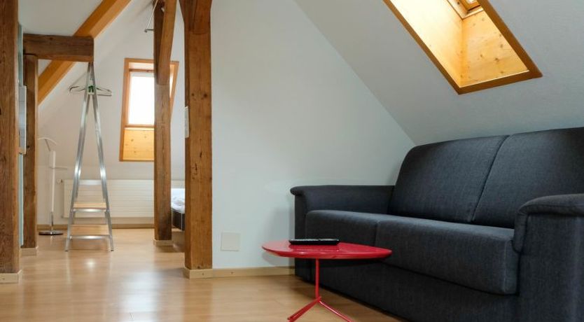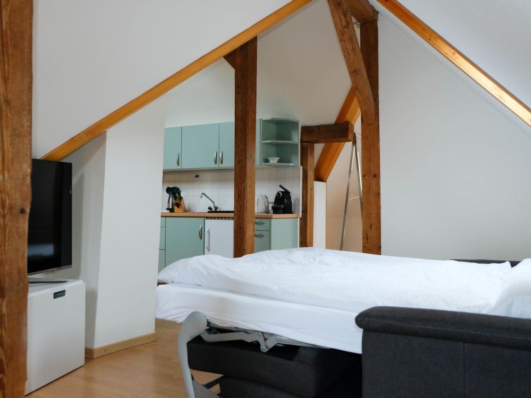 33 m2. More information by the provider: Cosily furnished attic studio with kitchenette, shower/WC, double bed as well as sophisticated pull-out sofa with 2 additional beds. Outdoor area with pergola for shared use. The deep blue Lake Thun beckons about 1 km away. Please note: The house does not have a lift and the studio is reached via 41 steps.