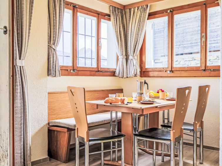 "Chalet Schöpfli", 3-room apartment 65 m2, on the ground floor, south facing position. Bright, partly renovated in 2025, very practical and cosy furnishings: large living/dining room with dining nook and electric heating. Exit to the garden. 1 room with 1 french bed (160 cm, length 200 cm).