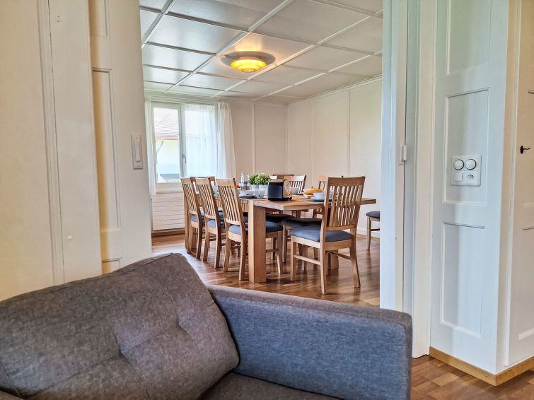 7-room chalet on 3 levels. Spacious and bright, comfortable and cosy furnishings: living room with Scandinavian wood stove and cable TV. Open dining room with sliding door. Exit to the balcony. Kitchen (oven, dishwasher, 4 ceramic glass hob hotplates, toaster, kettle, microwave, electric coffee machine, Capsules for coffee machine (Nespresso) extra, raclette grill).