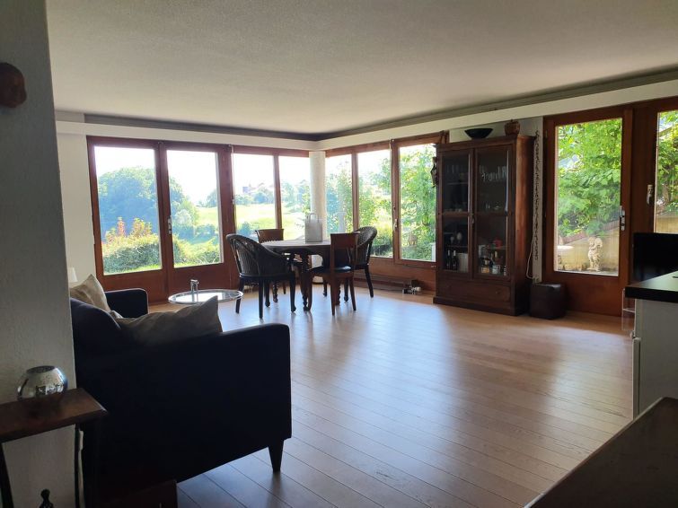 The large panoramic windows offer a stunning view of Lake Thun and the mountain range opposite. The spacious living area features a well-equipped kitchenette. The only criticism is that the windowless bathroom could be a bit brighter. It was a lovely week for us and our German Shepherd.