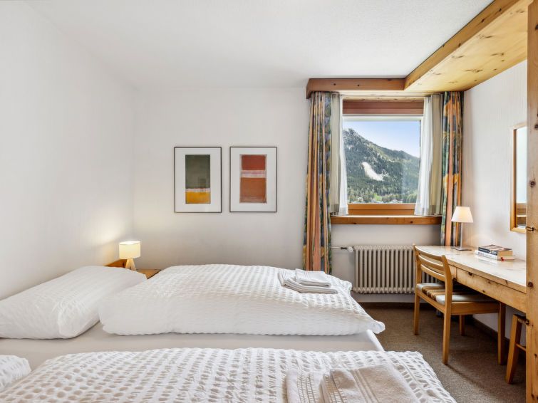 We were very pleased with this apartment, which is even better than it looks in the blurb. It is on the corner of the building, and the balcony has views in three directions. There is a living room, small kitchen, bathroom and extra toilet both opening off the entrance corridor, and a bedroom. It was perfectly convenient for four people as the living room can be closed off for the night. The kitchen is very well equipped, including necessities such as salt and dishwasher tablets, and incidentally enjoys a view over the town to the mountains. The beds were comfortable, there is plenty of storage space, and the wi-fi works well. The receptionists were friendly, and the swimming pool is warm and very clean. Davos itself is a ski resort - all modern buildings. It's not unpleasant but there's nothing much to see. The Utoring building is near the railway station, bus stops, a supermarket and one of the funicular lifts. The Davos/Klosters card was excellent, and we made a lot of use of the free public transport and mountain lifts.
