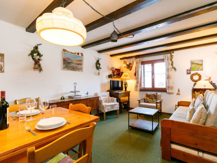 "Residenza Chesa Margun 13-5", 2-room apartment 53 m2, on the ground floor, south facing position. Practical and cosy furnishings: living/dining room with 1 sofabed (140 cm, length 190 cm), dining table and satellite TV. 1 room with 2 beds. Small kitchenette in the entrance (4 hot plates, oven, dishwasher, microwave).