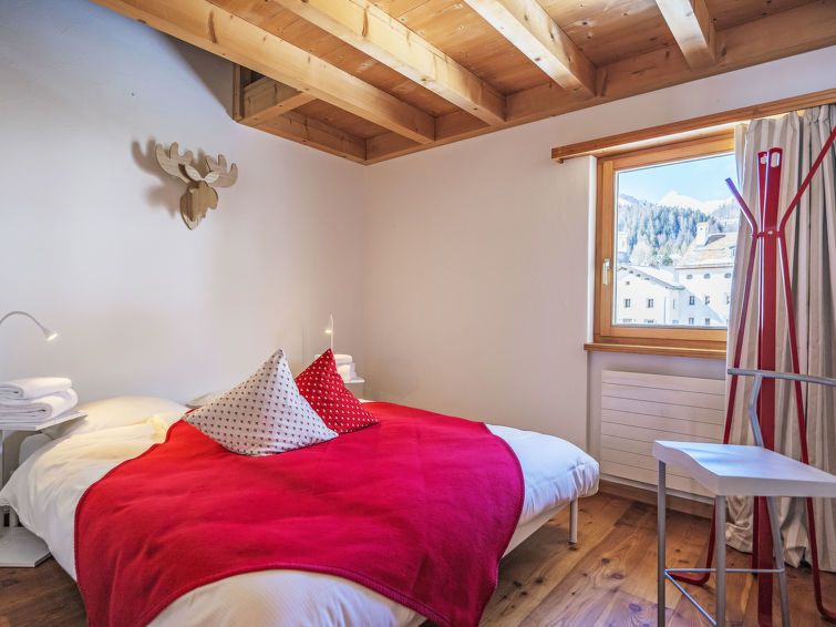 "Chesa Alossa", 3-room maisonette 75 m2 on 1st floor. Simple and cosy furnishings: open living/dining room with open-hearth fireplace, dining table, kitchen corner and TV (flat screen). Exit to the balcony. 1 small room with 1 french bed (1 x 160 cm, length 200 cm). Open large gallery with 1 french bed (1 x 160 cm, length 200 cm), shower/WC.