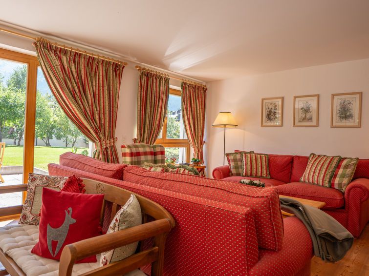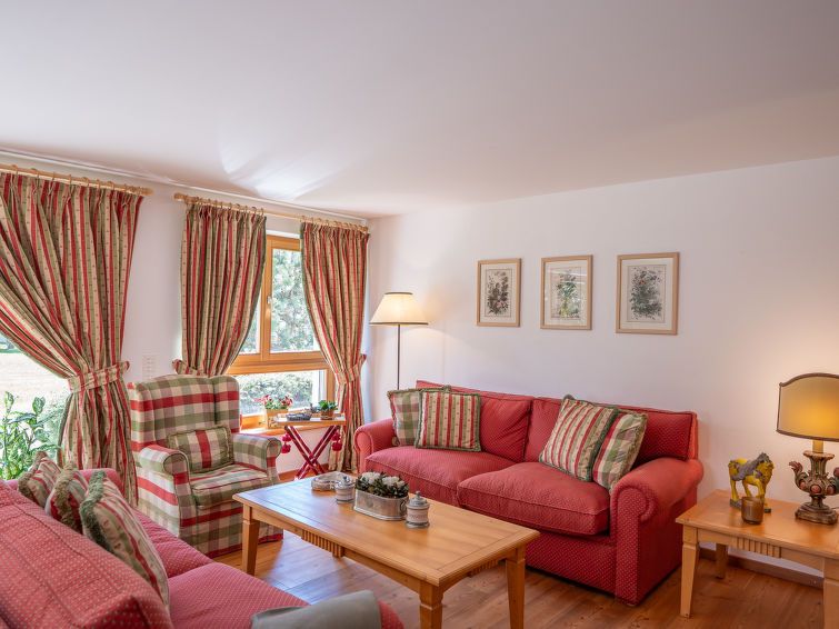 "Chesa Dal Luf B1", 3-room apartment 110 m2, on the ground floor. Spacious and bright, tasteful and cosy furnishings: large living/dining room with TV (flat screen). Exit to the garden, to the patio. 1 large double bedroom with 1 double bed (2 x 90 cm, length 200 cm), bath/WC and bidet.