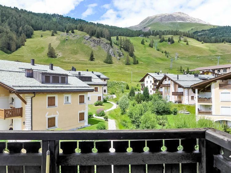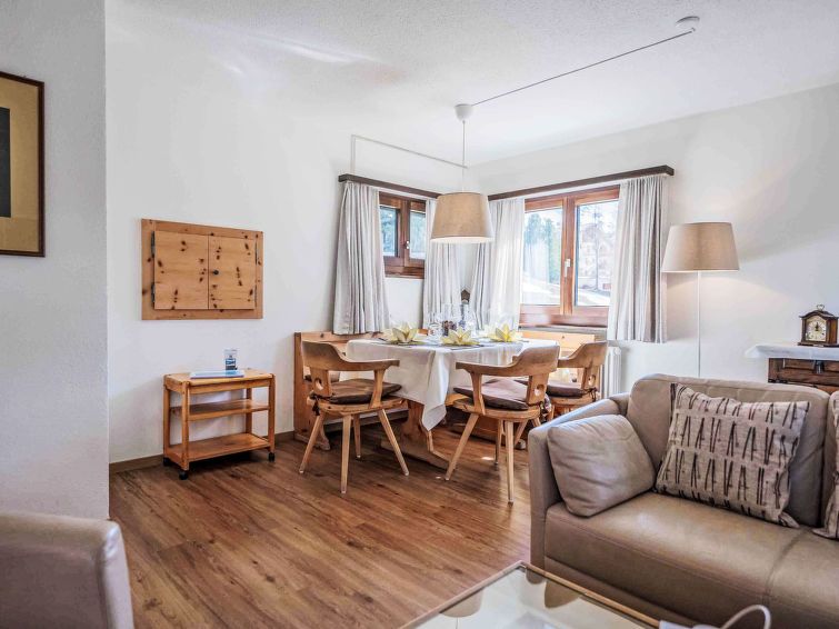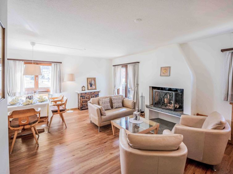 "Chesa Mulin", 4-room apartment 70 m2 on 1st floor. Partly renovated in 2018, comfortable furnishings: living/dining room with open-hearth fireplace, TV and radio. Exit to the balcony, north-west facing position. 1 small room with 1 x 2 bunk beds (90 cm, length 200 cm). 1 room with 2 beds (90 cm, length 190 cm).