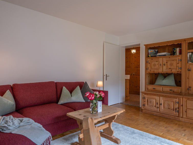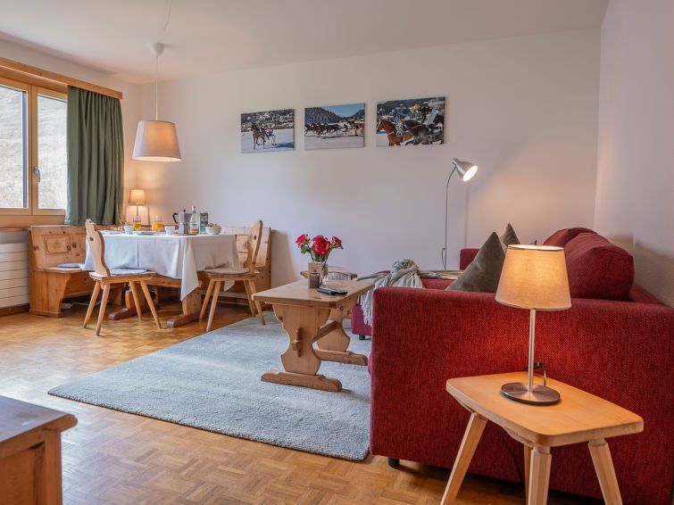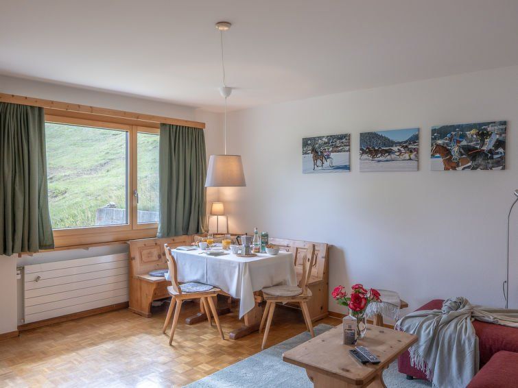 "Chesa Muntarütsch", 2-room apartment 55 m2 on 2nd floor. Cosy and wooden furniture furnishings: living/dining room with 1 sofabed (140 cm, length 190 cm), dining table and TV (flat screen). Exit to the balcony. 1 large double bedroom with 1 double bed (2 x 90 cm, length 200 cm).