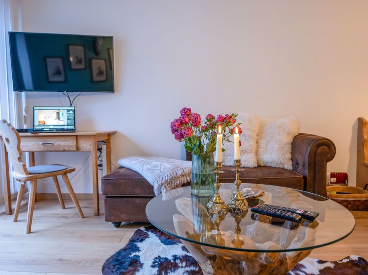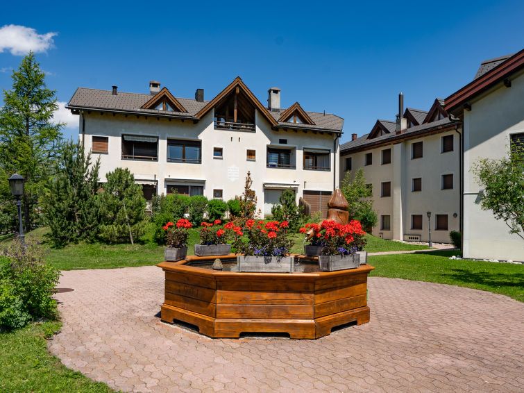 "Chesa Narcissa F4", 3-room apartment 60 m2, on the upper ground floor. Cosy and wooden furniture furnishings: living/dining room with TV (flat screen). Exit to the patio. 1 double bedroom with 1 double bed (1 x 180 cm, length 200 cm). 1 children's room with 1 bed (90 cm, length 200 cm).