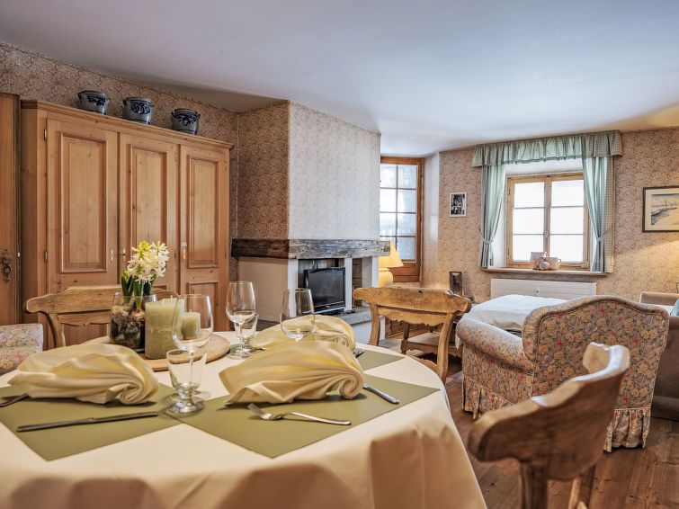"Chesa Olgiati 2", 2-room apartment 45 m2 on 2nd floor. Rustic and cosy furnishings: open living/dining room with 1 sofabed (140 cm, length 190 cm), TV (flat screen). Exit to the balcony. 1 double bedroom with 1 double bed (1 x 160 cm, length 190 cm), shower/WC. Kitchen (4 hot plates, oven, dishwasher, toaster, kettle, freezer, electric coffee machine, Capsules for coffee machine (Nespresso) extra, raclette grill, fondue Set (cheese)).