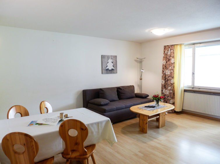 "Chesa Ova Cotschna 305", 2-room apartment 51 m2 on 3rd floor, west facing position. Practical and modern furnishings: living/dining room with 1 double sofabed (2 x 80 cm, length 200 cm), dining table and TV (flat screen). Exit to the loggia. 1 room with 1 double bed (2 x 90 cm, length 200 cm).
