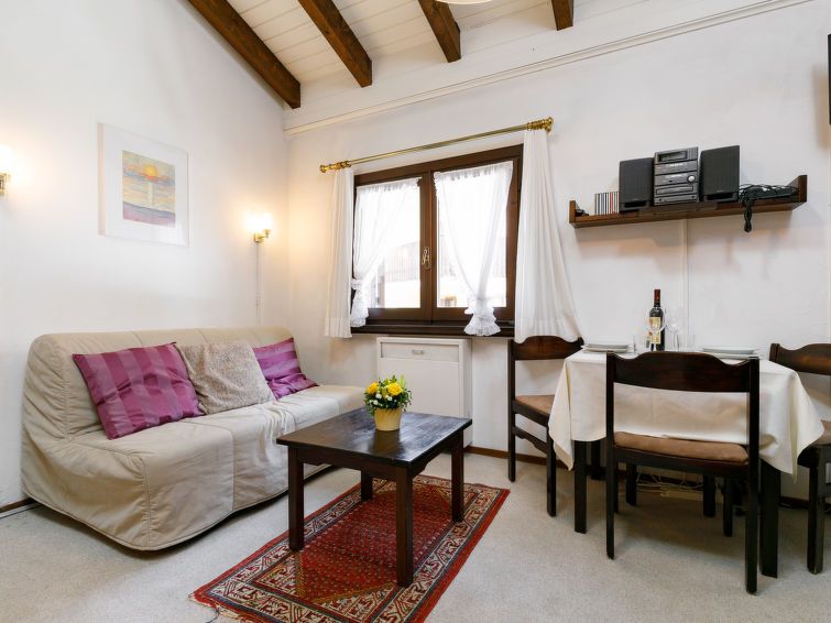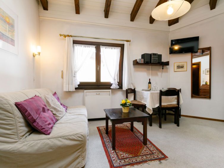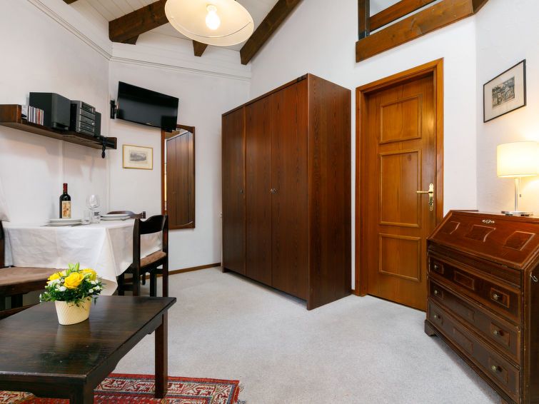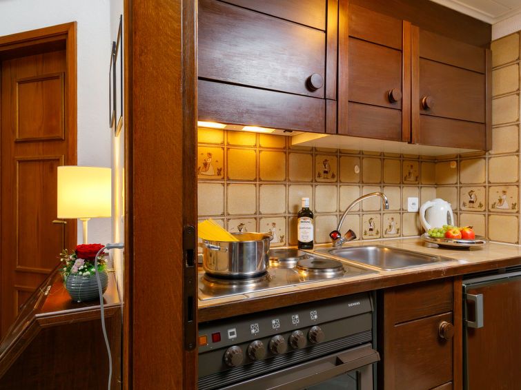 "Residenza Chesa Margun 15-1", 1-room apartment 33 m2 on 2 levels, north facing position. Practical furnishings: small living/dining room with 1 sofabed (160 cm, length 180 cm), digital TV and radio. Small kitchen in the entrance (oven). Shower/WC, bidet. Electric heating. Upper floor: (steep stair) open gallery with sloping ceilings, ceiling height 120 - 150 cm with 2 beds.