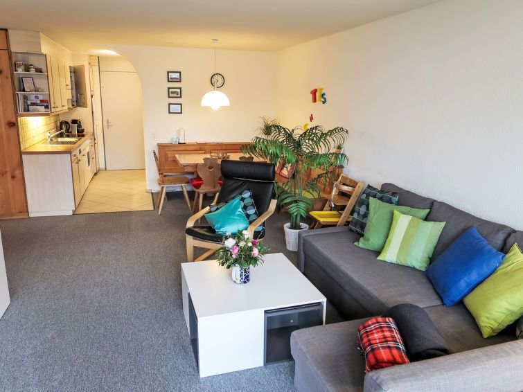 Very well equipped apartment for families. There are 2 single beds (separated by a curtain from the living room) and a bedroom with a bunk bed and a single bed. There is a large selection of well-preserved books, games and DVDs for children. Great sunny balcony and top location near the mountain railway. Ideal for mountain trips or ski days. We'd love to come back.