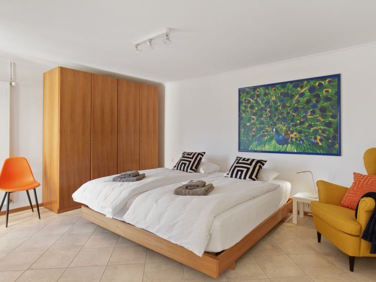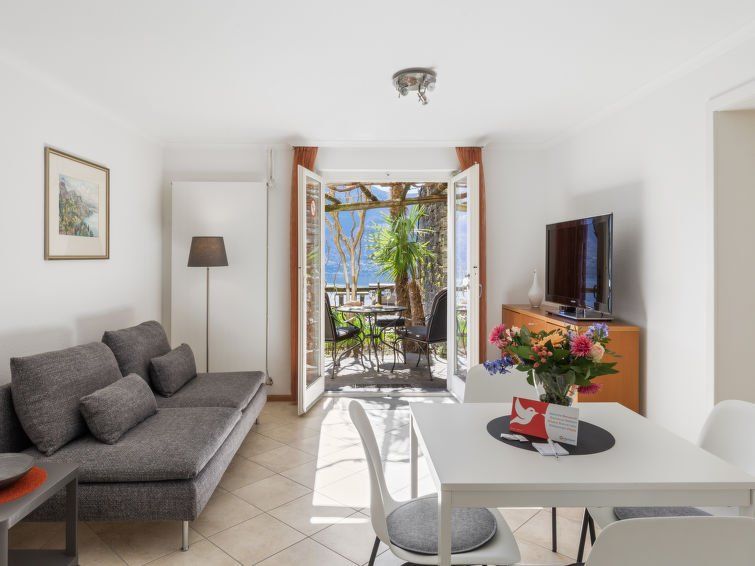 "Vista Isole di Brissago", 3-room apartment 58 m2, lower ground floor. Spacious and bright, partly renovated in 2023, comfortable and cosy furnishings: living/dining room with dining table, cable TV and international TV channels (flat screen). Exit to the garden, to the patio. 1 double bedroom with 1 double bed (2 x 100 cm, length 200 cm).