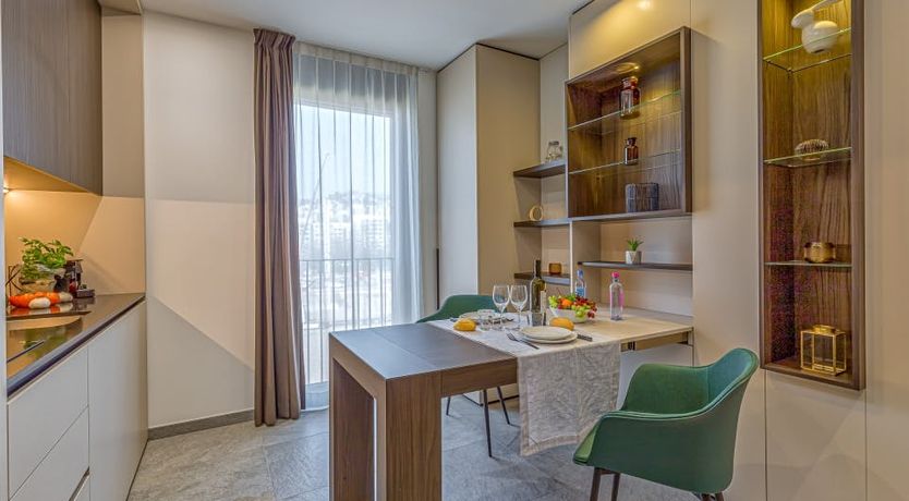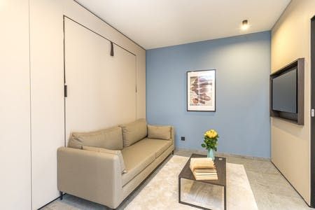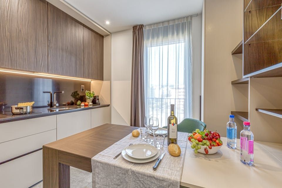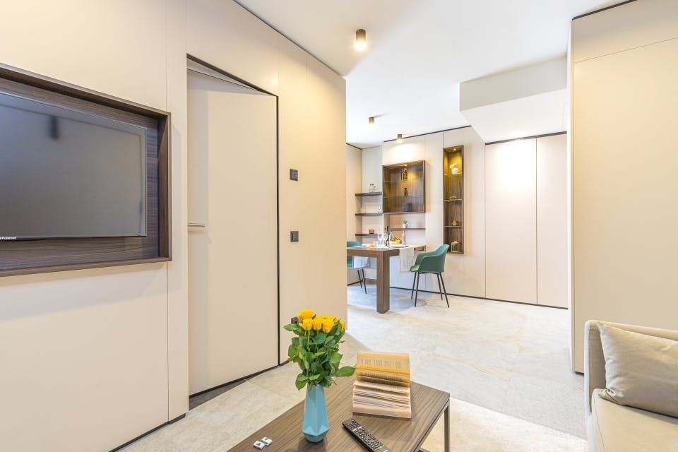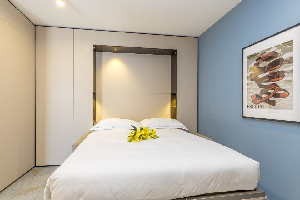 A twenty-minute stroll from the shores of Lake Lugano, this swish little apartment is perfect for a couple or solo traveller. The living area is set around an L-shape, so the dine-in kitchen feels separate from the sleeping quarters, despite it being a studio. Trinkets and object d’art on glass shelves add a touch of character. Come bedtime, a murphy bed transforms the living room into a bedroom. Within the building, you’ve got access to a gym, lounges and a communal working space.