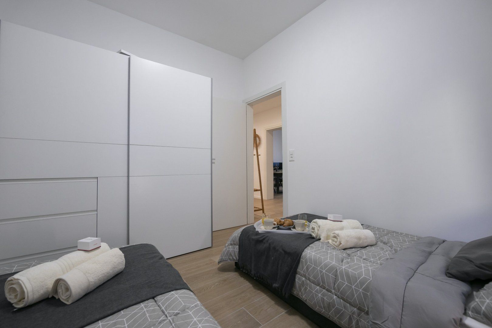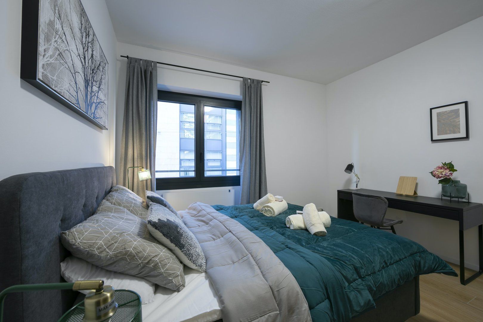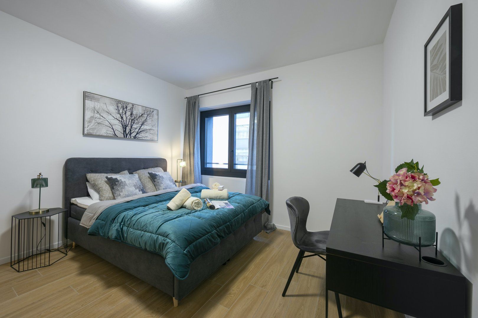 Modern, functional and conveniently located a seven-minute stroll from the peaceful shores of Lugano Lake, this apartment is an excellent base from which to explore Switzerland’s Italian-speaking Ticino region. Inside, a monochromatic colour scheme is emboldened with silver accents in the living space and jewel-toned blue in the main bedroom. You’ll begin your mornings with a cup of coffee on the balcony, breathing in the crisp fresh air, before whipping up a tasty breakfast in the fully-equipped kitchen.