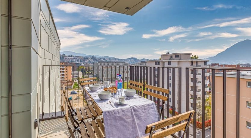 Boasting floor-to-ceiling glass doors that lead out onto a private balcony, soak up the scenic setting overlooking Lugano's architecture at the forefront of the stunning mountain landscape in the background.