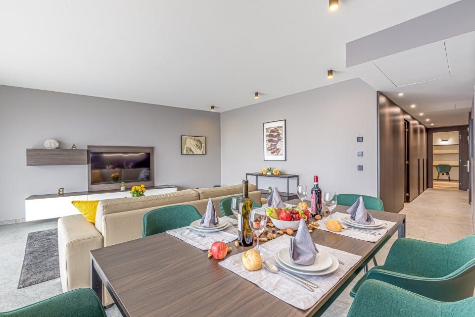 When it comes to meal times, you'll have the option to serve up a feast at the indoor dining area or when the weather is kind out on the balcony. So whether you spend blissful moments of relaxation with your feet up on the sofa or having a pamper session in the luxurious bathrooms – there's ample space to unwind after adventurous days discovering the Swiss countryside and lake activities.