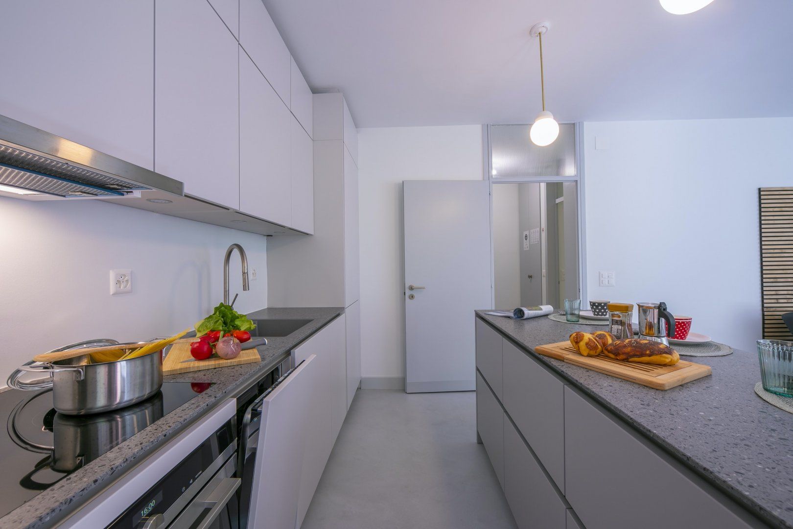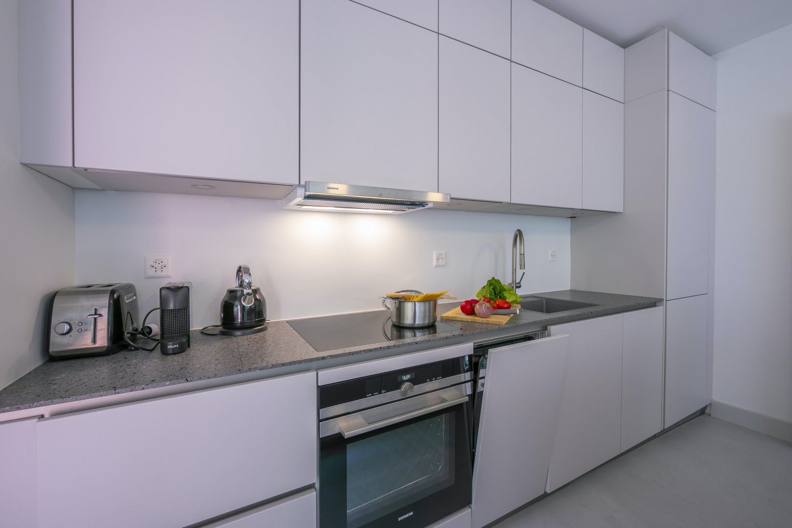 Contemporary furnishings and large windows provide a cool, sophisticated welcome in the open-plan living area where the sofas beckon hours lounging with a good book and the sleek kitchen is all set to help you cook up homemade feasts.