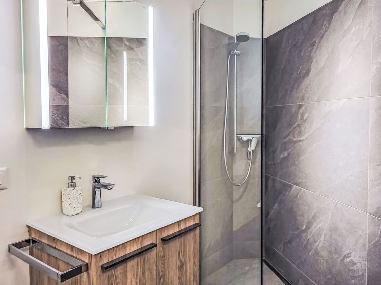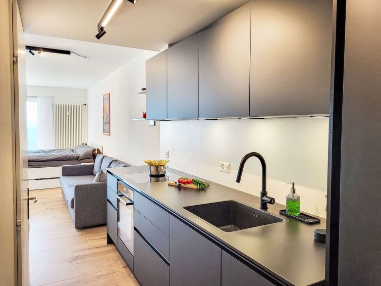 "Residenza Monte Brè - Apt. 203 Haus2", 1-room apartment 28 m2 on 2nd floor, south-west facing position. Fully renovated in 2025, comfortable and modern furnishings: open living/sleeping room with 1 sofabed (140 cm, length 200 cm), 1 double bed (160 cm, length 200 cm). Open kitchen in the entrance (oven, dishwasher, 4 induction hot plates, toaster, kettle, microwave, electric coffee machine, Capsules for coffee machine (Nespresso) extra).