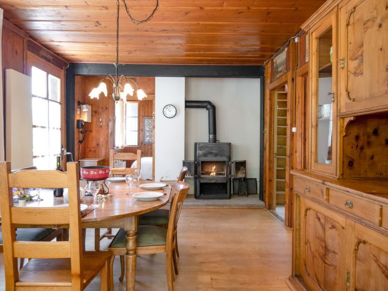"Dufaux", 5-room chalet 120 m2 on 2 levels. Very simple and wooden furniture furnishings: large living/dining room with wood-burning stove. Exit to the terrace. 1 room with 1 french bed (1 x 140 cm, length 190 cm). 1 room with 2 beds (90 cm, length 190 cm). Large kitchenette (4 hot plates, oven, dishwasher, freezer, electric coffee machine, Capsules for coffee machine (Nespresso) extra, raclette grill, fondue Set (cheese)).