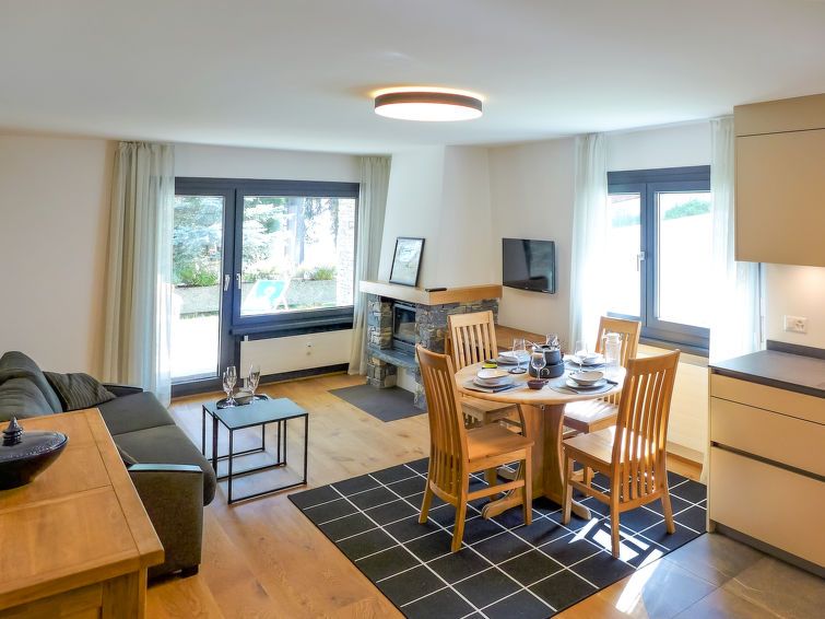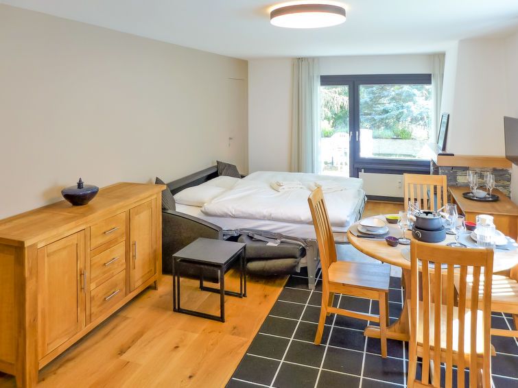 "Résidence La Fenière 03", 2-room apartment 60 m2, on the ground floor, south facing position. Bright, fully renovated in 2022, very modern and tasteful furnishings: living/dining room with 1 sofabed (160 cm, length 190 cm), open-hearth fireplace, cable TV and flat screen. Exit to the garden, to the terrace, south facing position.