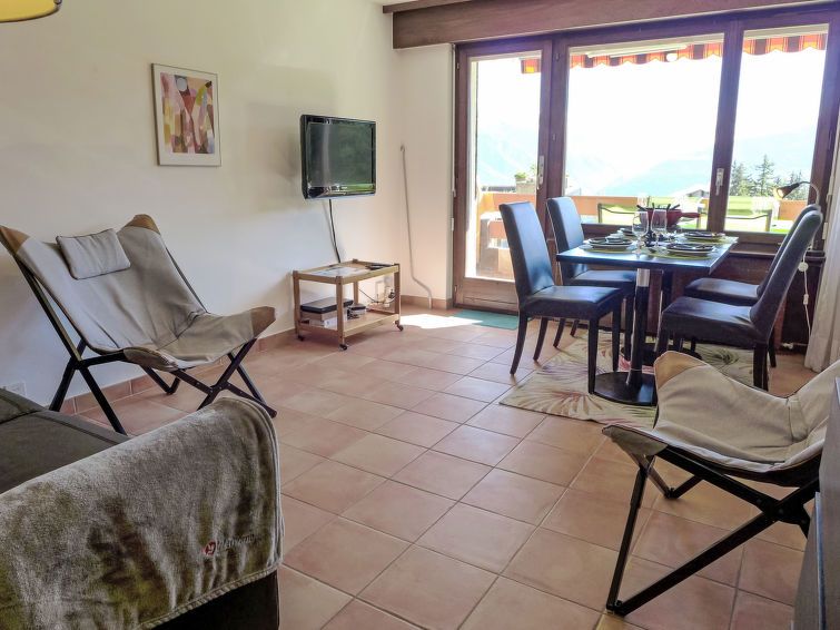 "Terrasse des Alpes 2006", 2-room apartment 49 m2 on 7th floor. Partly renovated in 2020, comfortable and beautiful furnishings: living/dining room with 1 sofabed (140 cm, length 190 cm), cable TV, radio and DVD. Exit to the balcony. 1 room with 1 french bed (180 cm, length 200 cm).