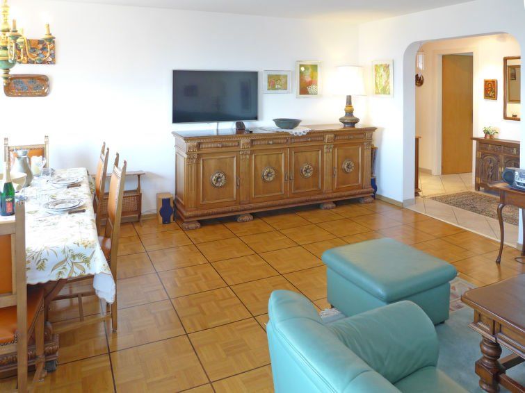 Spacious, comfortably furnished apartment with a beautiful view of the mountains and the village. Very well equipped with large TV, DVD, CD player, microwave oven, raclette oven, toaster, coffee maker, etc. Quiet, sunny location right next to a bus stop.