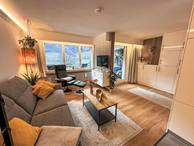 "Wohnung A113", 2-room apartment on 1st floor. Fully renovated in 2024, very beautiful and modern furnishings: living/sleeping room with 1 double sofabed (170 cm, length 210 cm), digital TV. Exit to the balcony. Alcove with curtain with 1 double bed (180 cm, length 200 cm). Kitchen (oven, dishwasher, 4 induction hot plates, toaster, kettle, freezer, electric coffee machine, combination microwave) with dining table.