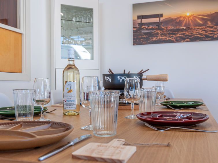 "Aiglon J2", 3-room apartment 75 m2 on 2nd floor. Object suitable for 2 adults + 4 children. Partly renovated in 2023, beautiful and cosy furnishings: entrance hall. Living/dining room with cable TV. Exit to the balcony. 1 room with 1 french bed (160 cm, length 190 cm). 1 small children's room 9 m2 with 2 x 2 bunk beds (80 cm, length 190 cm).