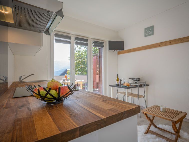"Beau séjour 15", 1-room studio 15 m2 on 1st floor, south-east facing position. Practical and comfortable furnishings: living/sleeping room with 1 double sofabed (1 x 140 cm, length 190 cm), dining nook and TV. Exit to the balcony, south-east facing position. Small, open kitchen (oven, 4 ceramic glass hob hotplates, kettle, electric coffee machine, Capsules for coffee machine (Délizio) extra, raclette grill, fondue Set (cheese)) with dining table.