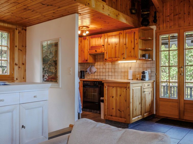 "Chalet Soleil", 4-room chalet 80 m2 on 2 levels. Comfortable and beautiful furnishings: entrance hall. Living/dining room with open-hearth fireplace and cable TV. Exit to the terrace, east facing position. Open kitchen (4 hot plates, oven, dishwasher, toaster, kettle, microwave, electric coffee machine).