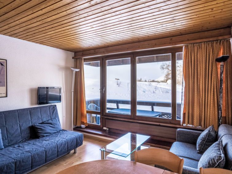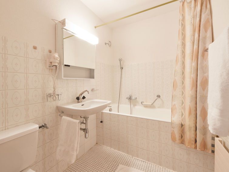 "Dixence 109", 2-room apartment on 1st floor. Practical and comfortable furnishings: living/dining room with 1 double sofabed (130 cm, length 190 cm), TV. Exit to the balcony, west facing position. 1 room with 2 beds (90 cm, length 200 cm). Open kitchen (2 hot plates). Bath/WC. Balcony.