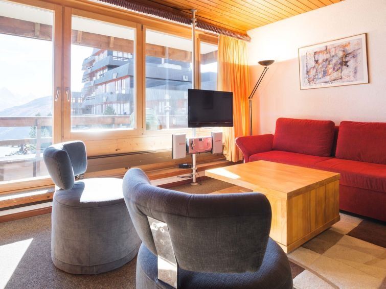 "Dixence 212", 1-room studio on 2nd floor. Practical and comfortable furnishings: living/sleeping room with 1 double sofabed (160 cm, length 190 cm), 1 wall-trunk bed (140 cm, length 200 cm), TV and DVD. Exit to the balcony. Open kitchen (oven, dishwasher, 4 ceramic glass hob hotplates).