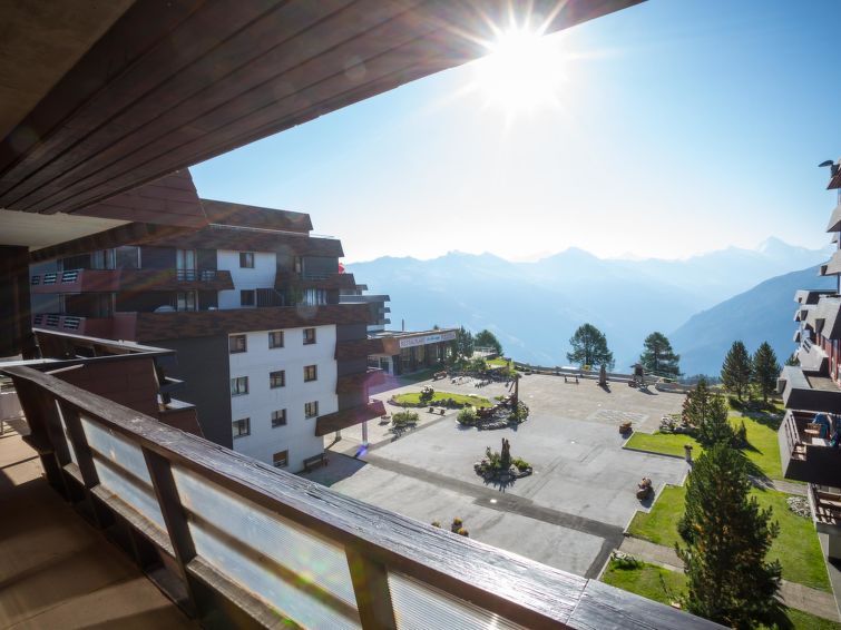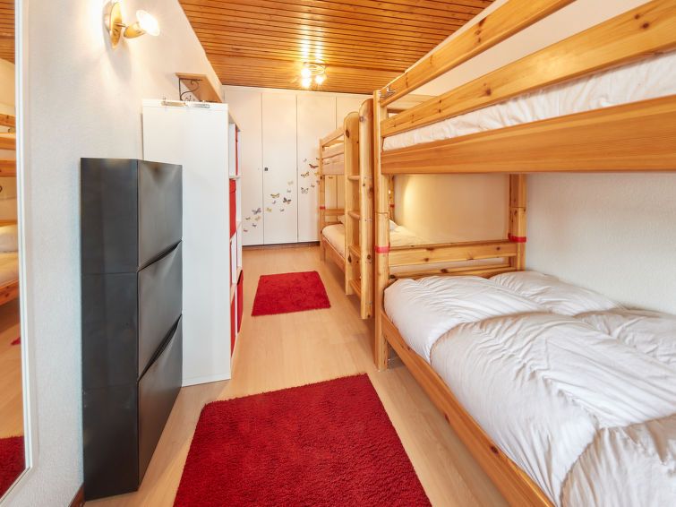 "Dixence 404", 2-room apartment on 4th floor. Practical and comfortable furnishings: living/sleeping room with 1 fold-away bed (140 cm, length 200 cm), TV. Exit to the balcony, east facing position. 1 room with 2 x 2 bunk beds (90 cm, length 200 cm). Open kitchen (oven, dishwasher, 4 ceramic glass hob hotplates, microwave).