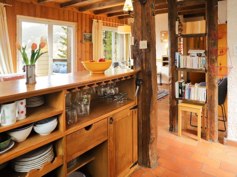 "Djabò 1er", 4-room maisonette 90 m2 on 1st floor. Simple and practical furnishings: living/dining room with open-hearth fireplace and electric heating. Exit to the terrace. 1 room with 1 french bed (140 cm, length 200 cm). Open kitchen (4 hot plates, dishwasher, 4 ceramic glass hob hotplates, raclette grill, combination microwave, fondue Set (cheese)).