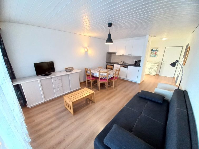 "Essert 101", 3-room apartment on 1st floor. Comfortable furnishings: living/dining room with 1 double sofabed (160 cm, length 200 cm), TV. Exit to the balcony. 1 room with 1 double bed (2 x 100 cm, length 200 cm). 1 room with 1 x 2 bunk beds (90 cm, length 190 cm). Open kitchen (oven, 2 ceramic glass hob hotplates).