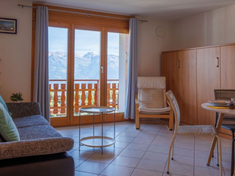 Nice little 2 room apartment located 10 minutes walk from the ski lifts. Magnificent view of the Rhone Valley.