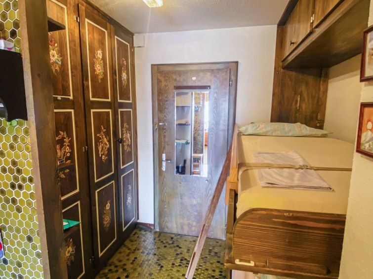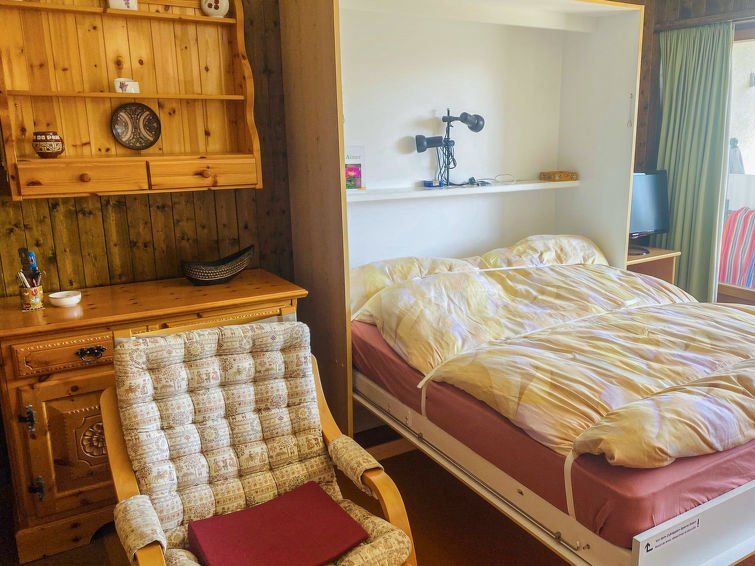 "Hameau A04", 1-room studio. Object suitable for 2 adults + 3 children. Simple and practical furnishings: living/sleeping room with 1 sofabed, 2 wall-trunk beds, 1 double wall-trunk bed and TV. Exit to the balcony. Open kitchen (4 hot plates, oven, electric coffee machine). Shower/WC.